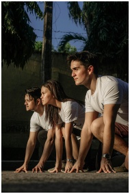 Three young adults crouched in a race position during daytime outdoors with determined expressions.
