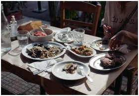 Cozy outdoor dining with a variety of Greek dishes shared among friends on a summer day.