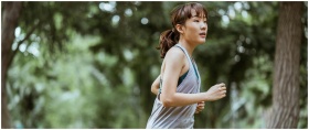 A young woman jogging with concentration through a