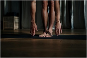 Adult man stretching during yoga session on mat indoors, promoting wellness and flexibility.