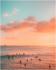 Surfers enjoy a breathtaking sunset at the beach in Honolulu, Hawaii, with vibrant sky colors.