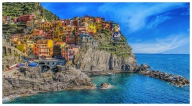 Vivid view of Manarola's colorful houses perched on cliffs, overlooking the blue sea.