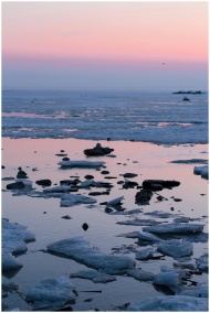 Tranquil icy seashore at sunset with pink skies re