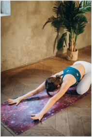 A woman in child's yoga pose on a galaxy-themed ma