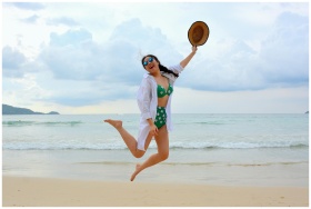 Woman jumps joyfully on a Phuket beach in summer, embodying carefree vacation spirit.