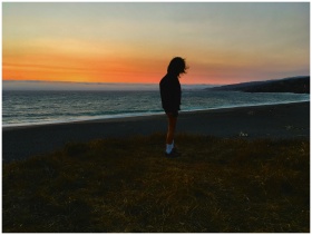 Silhouette of a woman standing by the ocean during a vibrant sunset at Stewart Point Beach, California.