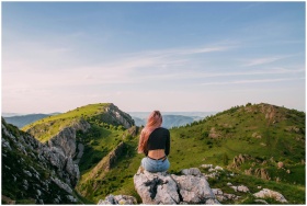 Woman sitting on rock with scenic mountain view in Rimetea, Romania, under clear skies.