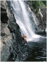 A woman sitting by a stunning waterfall in Norway, embracing nature's beauty.