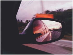 Scenic view of a vibrant sunset reflecting in a car's side mirror while driving through Puerto Plata, Dominican Republic.