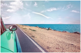 A scenic road trip in a vintage car along a stunning seaside landscape under a clear blue sky.