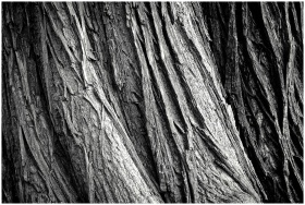 Closeup view of rugged tree bark texture in black and white, emphasizing nature's intricate patterns.