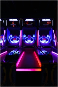 Vibrant and illuminated ski ball machines in a dark arcade setting.