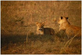 A lioness and her cub rest in the warm African savanna, showcasing wildlife beauty.