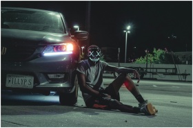 A person in a glowing mask sits beside a car at night, creating an eerie atmosphere.