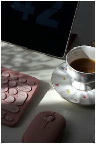 A serene workspace with a pink keyboard, mouse, and a floral coffee cup in morning light.