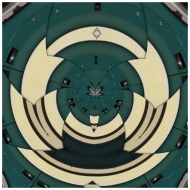 Circular abstract pattern with geometric shapes in blue and cream tones creating a kaleidoscope effect.