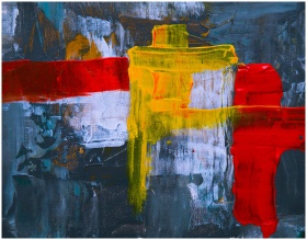 Vibrant abstract painting with bold red, yellow, and blue strokes on canvas.