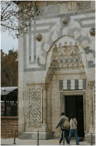 Two individuals walking into an ornate historic building with intricate stone carvings.