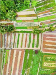 Colorful aerial shot of rice paddies and forest in Banten, Indonesia, showcasing lush greenery.
