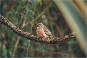 A serene image of a dove perched on a branch, surrounded by lush forest foliage.