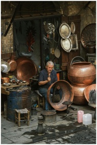 An artisan skillfully crafts copperware outside a traditional workshop, capturing the essence of craftsmanship.