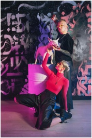Two fashion-forward models with a dog against an artistic graffiti backdrop, evoking a bold and creative vibe.