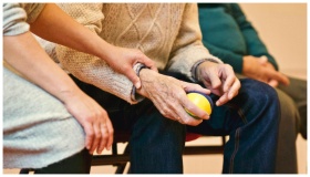 An elderly person receives support from a caregive