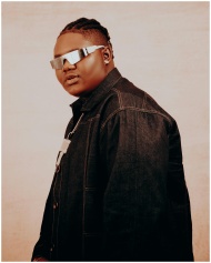 Stylish portrait of a person wearing futuristic reflective sunglasses and a denim jacket.