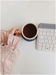 Stylish workspace with coffee, keyboard, and lace sleeve. Ideal for productivity themes.