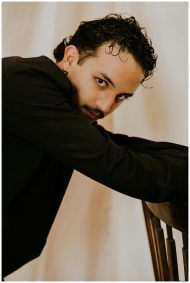 Close-up portrait of a man in a black jacket leaning on a chair indoors.
