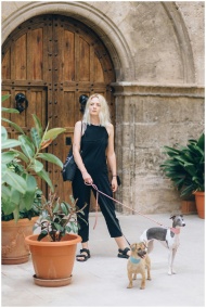 Blonde woman walks two dogs among potted plants near a rustic wooden door.