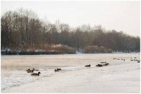 A serene winter scene with ducks swimming on a par
