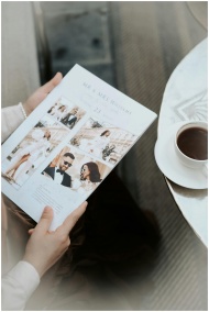 Person holding wedding magazine with coffee, focusing on elegance and lifestyle.