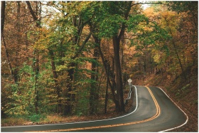 Explore a serene curvy road winding through autumn woods, rich with vibrant fall colors and foliage.