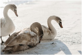 Three elegant swans resting peacefully on a snowy