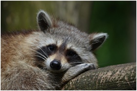 Close-up of a raccoon resting on a tree in natural habitat.