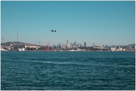 Scenic view of Istanbul's skyline from the Bosphorus with seagulls and a clear sky.