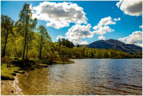 A serene landscape of a lake with surrounding trees and mountains under a clear blue sky.