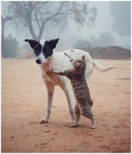 A stray dog and a cat engaging playfully on a fogg