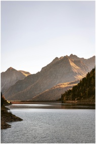 Peaceful lakeside view with majestic mountain backdrop at sunset, reflecting nature's beauty.