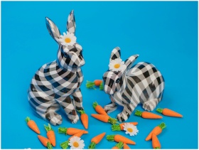 Playful checkered bunny figurines surrounded by ca