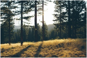 Sunlight filters through pine trees, casting shado
