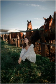 A woman in a white dress sits near a pen of horses
