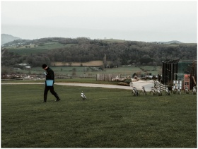 A person with a bucket walks on a grassy field followed by penguins, set against a rural backdrop.