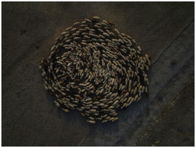 Aerial shot of a sheep flock spiraling on a barren field in rural Türkiye.
