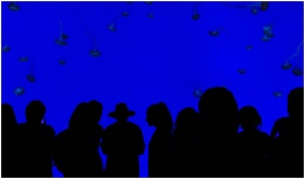 Crowd of silhouettes watching jellyfish in a vibrant blue aquarium exhibit.