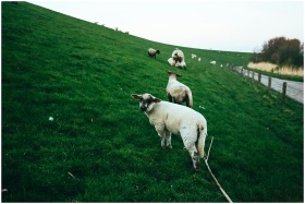 Serene countryside scene featuring sheep grazing on a lush green hillside meadow.