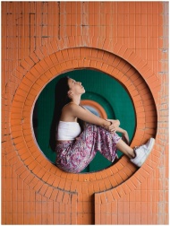 Young woman sitting in round brick opening, embracing a moment of reflection in George Town.