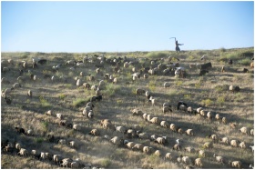 A shepherd guides a large flock of sheep across a sunlit hill in Tatvan, showcasing rural life.