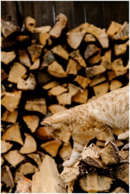 A tabby cat explores a pile of chopped wooden logs